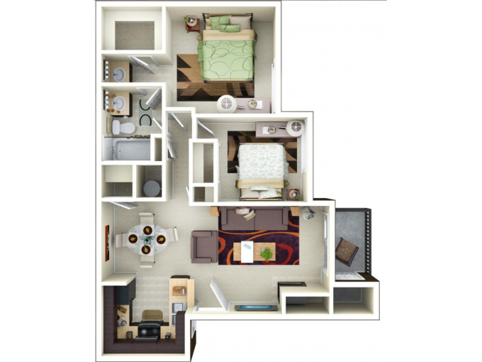 Residence 3: Two Bedrooms / Two Bathrooms 920 Sq. Ft. Practical, yet thoughtful design provides this residence with the benefit of dual masters for the ultimate in privacy. The vaulted ceilings and fireplace add elegance to the living room, while the abundance of community amenities make it a pleasant, but difficult choice on whether to stay in and relax or go out an play.