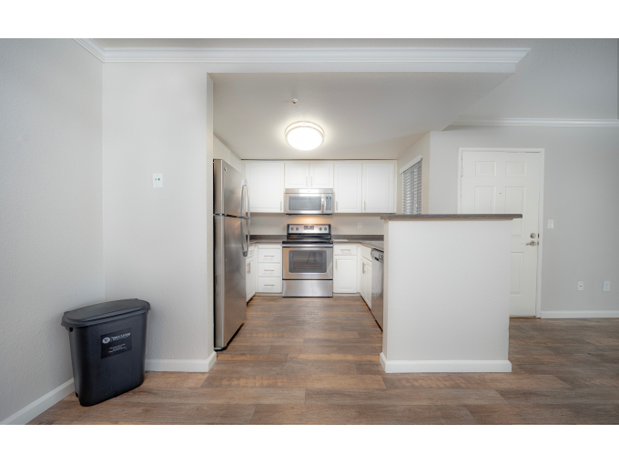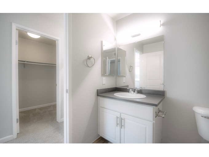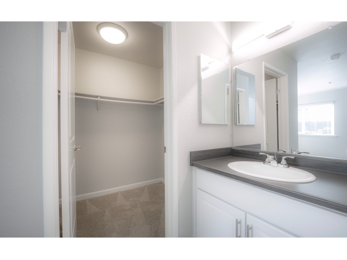 Residence 2: Two Bedroom / One Bath 821 Sq. Ft. A graceful window adorns the large modern kitchen which features abundant cabinets and counters. The master suite features a private vanity and sink and oversize closet. The second bedroom offers you a multitude of living options-roommate, home office, nursery, hobby room, you name it-it works.